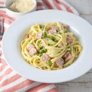 Looking to use up some leftover Ham? Try this Fettuccine Alfredo with Ham and Peas! This comes together in about 15 minutes and is oh so savory! Perfect for those busy nights!