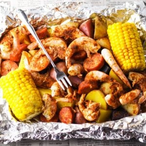 I changed it up a little. I added a bit more seasonings such as Tony Chachere’s Cajun seasoning, a little tiny bit or garlic (and I mean tiny bit) and Cayenne pepper. I also quartered an onion and threw that into the mix. We are a family of five so to make things more affordable and easy, I bought cooked shrimp, red potatoes and threw everything onto a large baking pan, put the foil on top and baked it. This recipe is a HIT! My son is in love with this meal! I’m making it as I write this. Thank you soooo much for sharing! ?